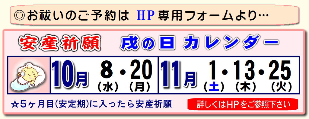 お正月のお手伝いさん募集(詳細は下のお知らせより) ご祈祷・お祓いはお早めにご連絡、又は事前予約をお願い致します。 「予約カレンダー」を確認の上「祈願案内」(menu内)をご参考し、ご予約ください ★参加者 [残り9名] ◎10月28日「お不動ご縁日」◆詳細◆ 〃 10:00 読経会 「般若心経・観音経・舎利礼文・十三仏真言」など 〃 11:00 お護摩焚きにご参加下さい(事前予約も可能です)